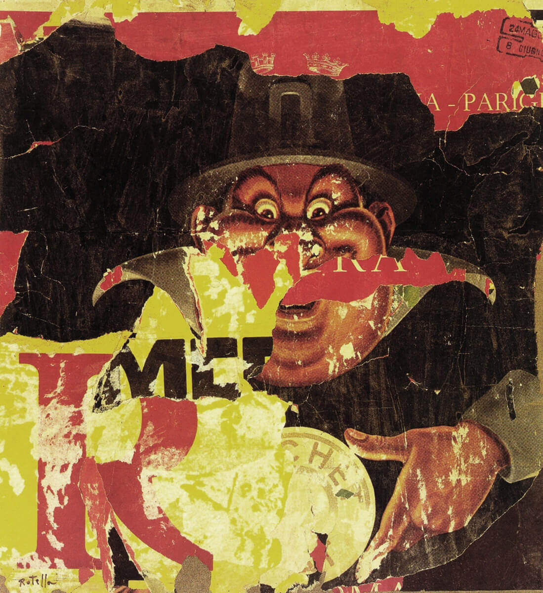 “L’illuminazione”, così dichiarava l’artista, arrivò una mattina del ’53: “Giravo in Piazza del Popolo — ricorda —, ero in crisi, non volevo più dipingere, poi vedo un manifesto lacerato. Mi fermo. Ho un colpo al cuore, una specie di choc. Forse è questo il nuovo messaggio, mi dico”. Un messaggio che dà alla luce il Rotella che ammiriamo, non solo il precursore del movimento Nouveaux Réalistes (la sua prima mostra è del ’55, recensita da Milton Gandel), ma soprattutto il più costante, incrollabile e sofisticato utopista in quel gruppo al quale partecipa nel 1961, invitato dal critico Pierre Restany, nella cui sfera Raymond Hains, Jacques Mahé de la Villeglé, François Dufrêne si servivano, pur con tecniche similari, di manifesti pubblicitari. E’ stato il più attento dialogatore d’europa con gli amici artisti della Pop Art. “Io penso di discendere da Duchamp — spiegava Rotella — Sento forte questa derivazione europea che mi distingue dagli americani. Ho dentro di me la Magna Grecia“.