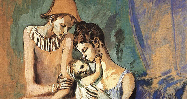 La mostra si apre con i Saltimbanchi, realizzati tra il 1904 e il 1906, a cavallo tra quelli che sono stati solitamente denominati come periodo blu e periodo rosa dell’artista, che racchiudono in maniera esemplare l’immaginario figurativo dell’universo circense del giovane Picasso. Un tema caro quello dei Circensi, isolati o in gruppo, ritratti lontani dal palcoscenico e visti nella quotidianità, dove esprimono malinconia ma affettività, con le donne che accudiscono i bambini, e con Arlecchino – l’alter ego dell’artista – che riesce a trasmettere un intenso sentimento di paternità, di famiglia: i girovaghi sono preda dell’angoscia della povertà, ma nonostante questo testimoniano le gioie della vita domestica.